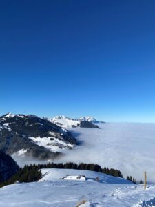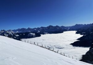 die sonne lockt über die nebeldecke. brot schmieren, mit rucksack und schneeschuhen fahre ich zur talstation. mal schauen wie viele sonnenhungrige bereits anstehen, sonst fahre ich gleich weiter. die zweite gondel bringt mich auf den berg. hundert minuten später bin ich auf der niederbauen kulm, 1924 m.ü.m. (heute +1 meter schnee). neben der aussicht war auch der aufstieg atemraubend. der beliebte aussichtspunkt füllt sich zusehends, alle wollen heute hochhinaus.