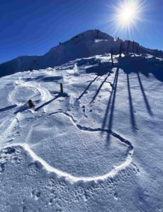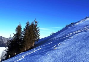 nach einer weile wird es mir auf der hölzernen bank zu eng und zu laut. am punkt wo die stille das gemurmel wieder überdeckt, schweift mein blick zu den südlichen schneebergen. aus dem augenwinkel nehme ich eine einzelne schneeschuhläuferin war, die in der vorgepfadeten spur zum aussichtspunkt hoch läuft. nach kurzer zeit kommt sie zu mir rüber, bleibt in rufweite stehen und fragt mich: «ob es mich stören würde, wenn sie hier pause macht, es sei ihr zu laut da drüben».